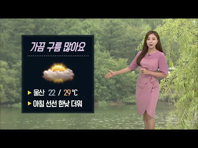 [흐린 가운데 무더위... 내일 가끔 비 5~30mm] 비가 그치고 날이 다시 무더워졌습니다. 금요일인 오늘은 흐린 하늘 속 무더위가 예상되는데요. 현재 울산의 아침 기온은 21도로 약간 선선하게 출발하고 있고요. 낮 기온은 32도까지 올라 덥겠습니다. 토요일인 내일은 비가 내리겠습니다. 북쪽을 지나는 기압골의 영향으로 ...