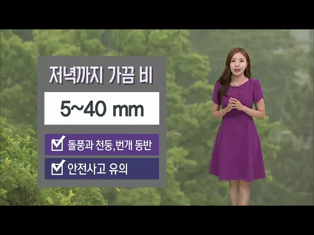 [오늘 가끔 비... 저녁까지 5~40mm] 월요일 아침 출근길, 우산 챙기시기 바랍니다. 현재 하늘은 잔뜩 흐린 가운데, 정체전선의 영향으로 오늘 저녁까지 가끔 비가 오겠습니다. 오늘 저녁까지 내리는 비의 양은 5~40mm 정도입니다. 비가 내리면서 돌풍과 천둥, 번개를 동반해 요란하게 내리는 곳도 있어서요. 비 피해 없도록...