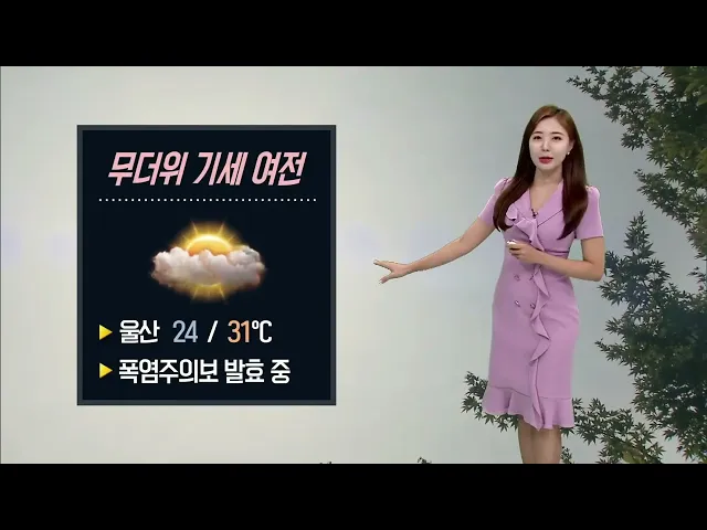 [낮 최고 31도 무더위... 오후 구름 많아] 오늘도 무더위의 기세가 여전하겠습니다. 울산에는 폭염주의보가 발효 중인 가운데 오늘 낮 기온이 31도까지 오르며 어제만큼 덥겠습니다. 기온이 높은데다가 습도도 높아서 몸으로 느끼는 더위는 더 심하겠는데요. 이에 따라 온열질환이 발생하지 않도록 각별한 주의가 필요하겠...