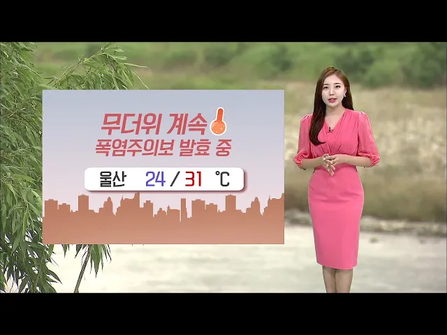 [푹푹 찌는 무더위... 울산 폭염주의보] 오늘도 푹푹 찌는 무더위가 예상됩니다. 태풍이 열대지방에서 몰고 온 뜨거운 수증기로 인해 전국에 폭염특보가 발효 중인데요. 울산에는 폭염주의보가 발효 중인 가운데 오늘 낮 최고기온이 31도까지 오르겠습니다. 여기에 습도가 높아서 더 덥게 느껴지겠습니다. 폭염특보가 이어...