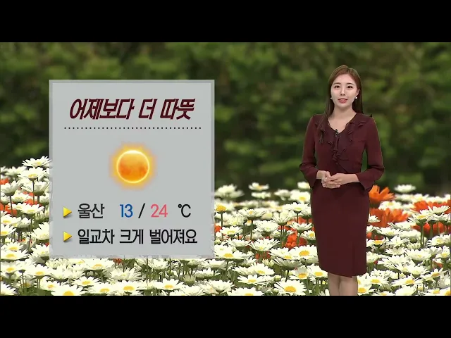 [맑고 어제보다 더 따뜻... 해안 강풍 유의] 1) 어제에 이어 오늘도 맑은 날씨가 예상됩니다. 현재 울산은 13도를 기록하면서 다소 서늘하게 출발했는데요. 낮 동안에는 24도까지 기온이 올라서 어제보다 더 따뜻하겠습니다. 낮과 밤의 기온차가 10도 이상 크게 벌어지는 만큼 얇은 외투를 챙기시는 게 좋겠습니다. 2) 오늘...