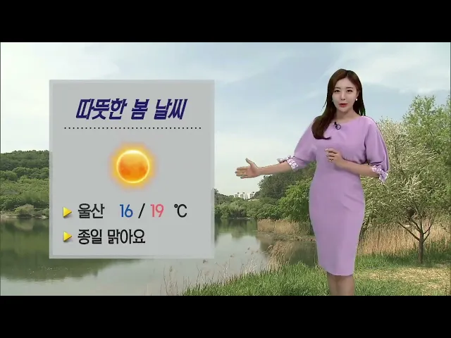 [낮 최고 25도, 맑고 따뜻... 주말 맑음] 1) 봄비가 그치고 오늘은 하늘 표정이 맑겠습니다. 봄 햇살이 내리쬐면서 기온도 오르겠는데요. 오늘 울산의 낮 최고기온은 25도까지 올라서 무척 따뜻하겠습니다. 다만 어제 내렸던 비로 인해 아침까지 가시거리 1km 미만의 안개가 끼는 곳이 있어서 교통안전에 유의해 주셔야겠습...
