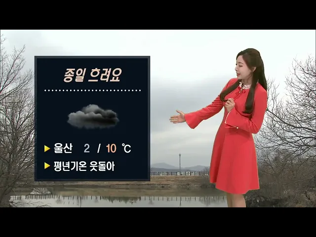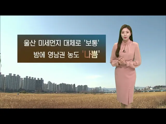 [종일 흐리고 평년기온 웃돌아... 미세먼지 '좋음'] 1) 오늘도 종일 흐린 하늘 속에 기온은 평년보다 높겠습니다. 울산의 현재 기온 2도를 보이고 있고, 한낮에는 낮 기온이 10도까지 크게 오르겠습니다. 낮 기온이 다소 높더라도 아침저녁으로는 춥습니다. 옷 따뜻하게 입으시기 바랍니다. 2) 하늘은 흐리지만 공기는 대체...