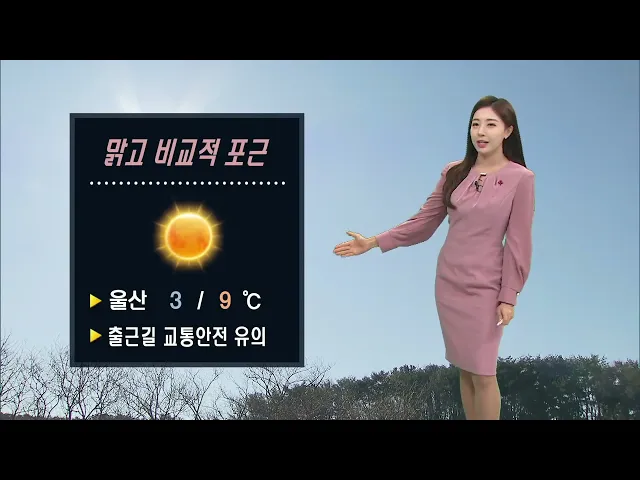 [맑고 포근... 울산 건조주의보] 1) 오늘은 맑은 하늘에 기온까지 포근합니다. 현재 울산은 3도로 아침 기온 비교적 포근한데요. 한낮에는 9도 가지 올라서 어제보다 기온이 1~3도가량 높겠습니다. 다만 어제저녁 살짝 내린 비로 인해 출근길 도로가 미끄러울 수 있겠습니다. 교통안전에 유의하시기 바랍니다. 2) 어제 비가...