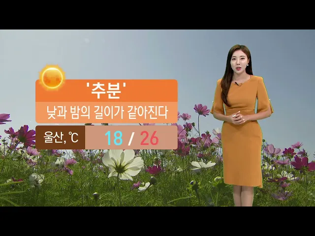 [절기 '추분' 맑고 일교차 커.. 미세먼지 '좋음']1) 긴 연휴가 끝나고 다시 일상으로 돌아가는 목요일입니다. 오늘은 절기 상 추분이기도 한데요. 낮과 밤의 길이가 같아진다는 추분인 오늘은 맑은 하늘이 예상됩니다. 울산의 현재 기온은 18도로 서늘하고요. 한낮에는 26도로 일교차 큰 가을 날씨가 이어지겠습니다.2) 가...