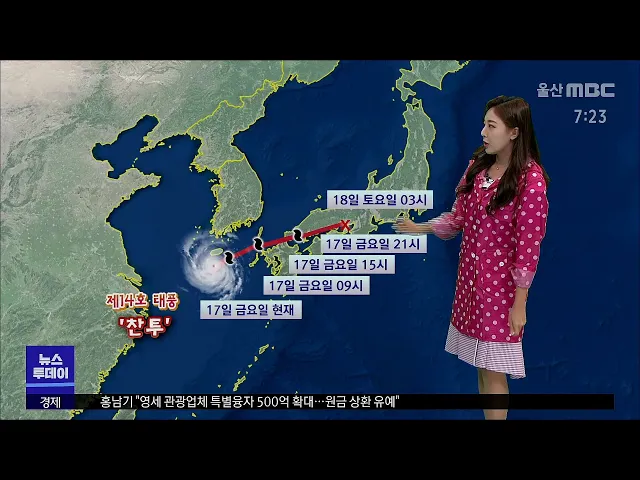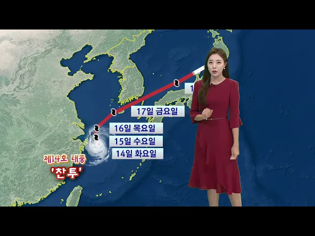 제14호 태풍 “찬투”는 현재 중국 상하이 동쪽 약 180km 부근 해상에 위치하며 아주 느린 속도로 북상중입니다. 내일까지 제주도를 중심으로는 태풍의 간접 영향권에 들겠고요. 모레와 글피는 남부 지방과 제주도를 중심으로 차차 태풍의 영향권에 들 것으로 예상됩니다. 태풍의 간접 영향권에 들면서 내일 오전까지 가끔...