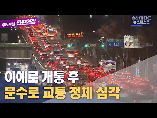 ◀ 앵 커 ▶지난달 이예로가 완전 개통되면서 울산 북구에서 부산까지 40분만에 오갈 수 있게 됐습니다.그런데 이예로 진입구간이 있는 문수로쪽은 이전보다 더 꽉 막혀서 민원이 빗발치고 있습니다.◀ 리포트 ▶[이장걸 울산시의회 의원]저는 오늘 퇴근 길 울산 남구 옥동공원묘지 인근에 나와 있습니다.이예로로 진입하기 위...