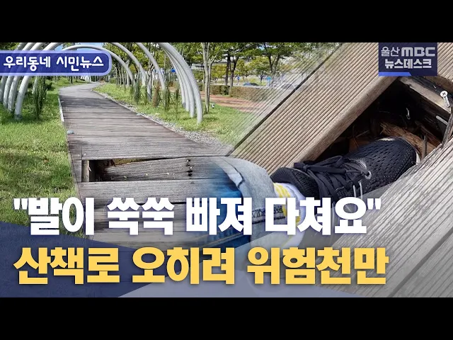 [앵커]울산MBC와 울산시청자미디어센터가 함께 만드는 우리동네 시민뉴스입니다.중구의 한 공원 안에 시민들을 위해 조성된 데크 산책로가 관리가 제대로 되지않아 위험한 곳이 많다는데요. 시민기자가 직접 현장을 담아왔습니다. [리포트]울산 안전보건공단과 동서발전 사이에 있는 산책로 데크입니다. 시민들이 건강을 다...