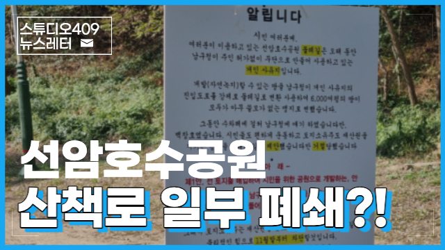 스튜디오 409 뉴스레터 /선암호수공원 일부 구간산책로 폐쇄 위기?최근 선암호수공원에서 산책 해 보신 분?저도 무척이나 좋아하는 곳이라 둘레길 산책을 가끔 하는데요, 최근 낯선 안내 표지판이 하나 보이더라구요.🚫안내판에는"여러분이 이용하고 있는 둘레길은 오랫동안 남구청이 주인 허가 없이 무단으로 만들어 사용...