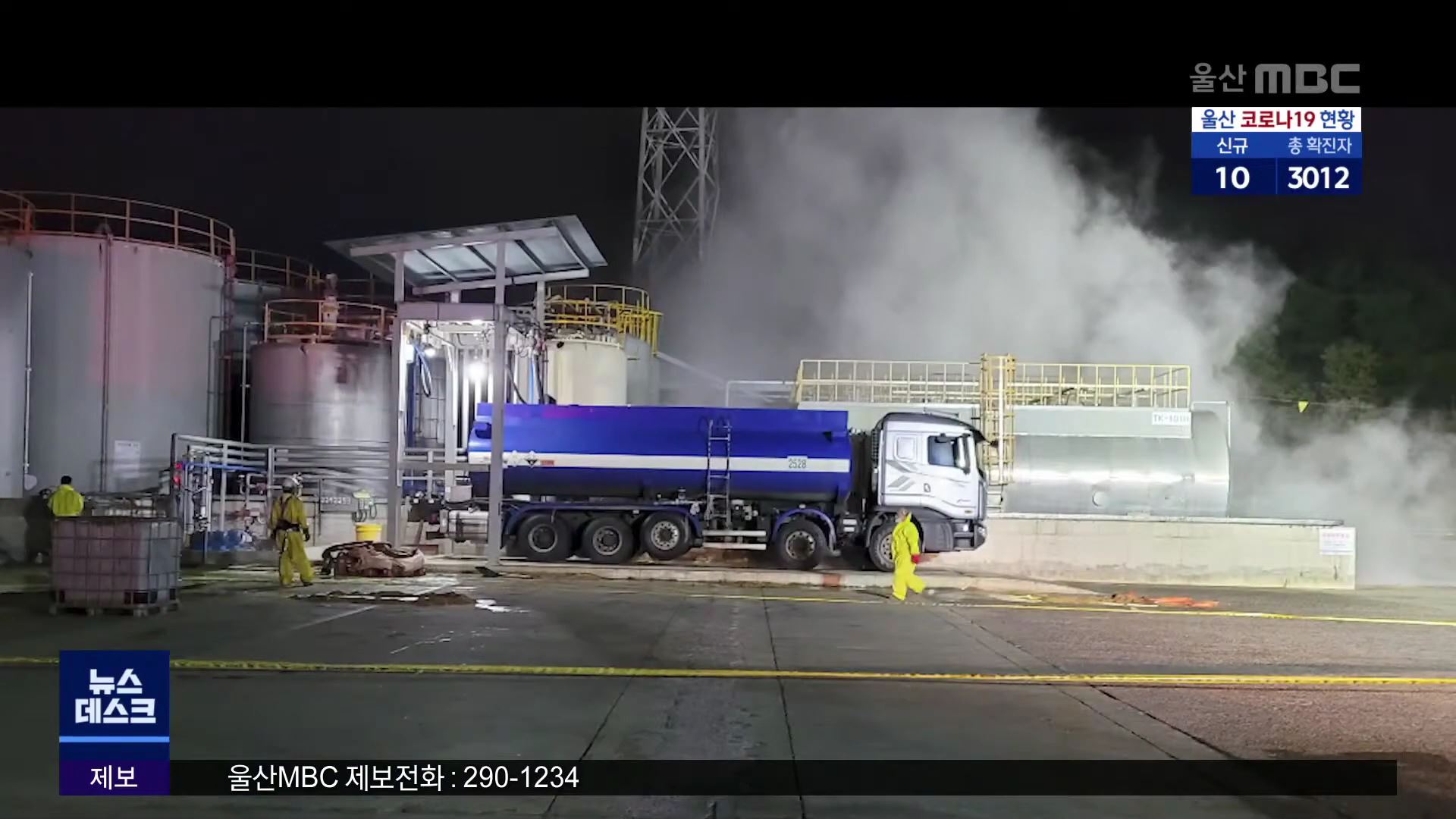 오늘(7/17) 새벽 0시 50분쯤 울산 울주군 온산읍 화공약품 전문 유통업체인 비룡케미칼에서 탱크에 저장된 염산이 누출되는 사고가 발생했습니다. 누출된 염산의 양은 5.5톤으로 확인됐습니다. 이 사고로 인근 마을 주민 9명이 호흡 곤란을 느껴 병원에 가서 치료를 받았습니다. 소방당국은 염산저장탱크가 파손돼 염산이 ...