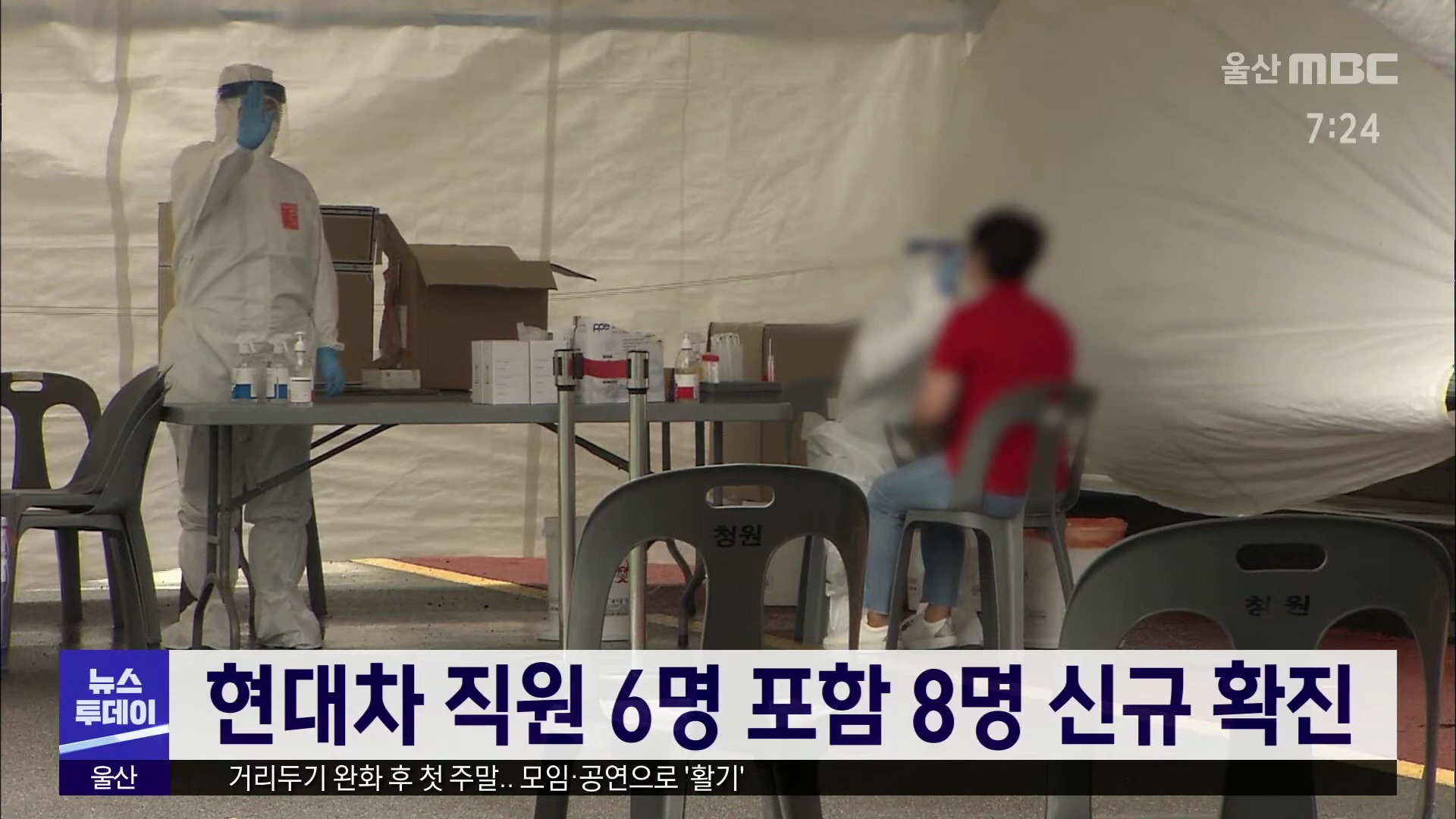 울산에서는 오늘(6/27) 코로나19 추가 확진자8명이 발생했습니다.이 가운데 6명은 지난 26일 확진 판정을 받은현대자동차 직원과 접족한 동료 직원으로파악됐습니다.다른 1명은 해외 입국 뒤 자가격리 해제 전 검사에서 확진판정을 받았으며, 나머지 1명은 감염경로를 조사하고 있습니다.울산시는 확진자 거주지에 대한 방...