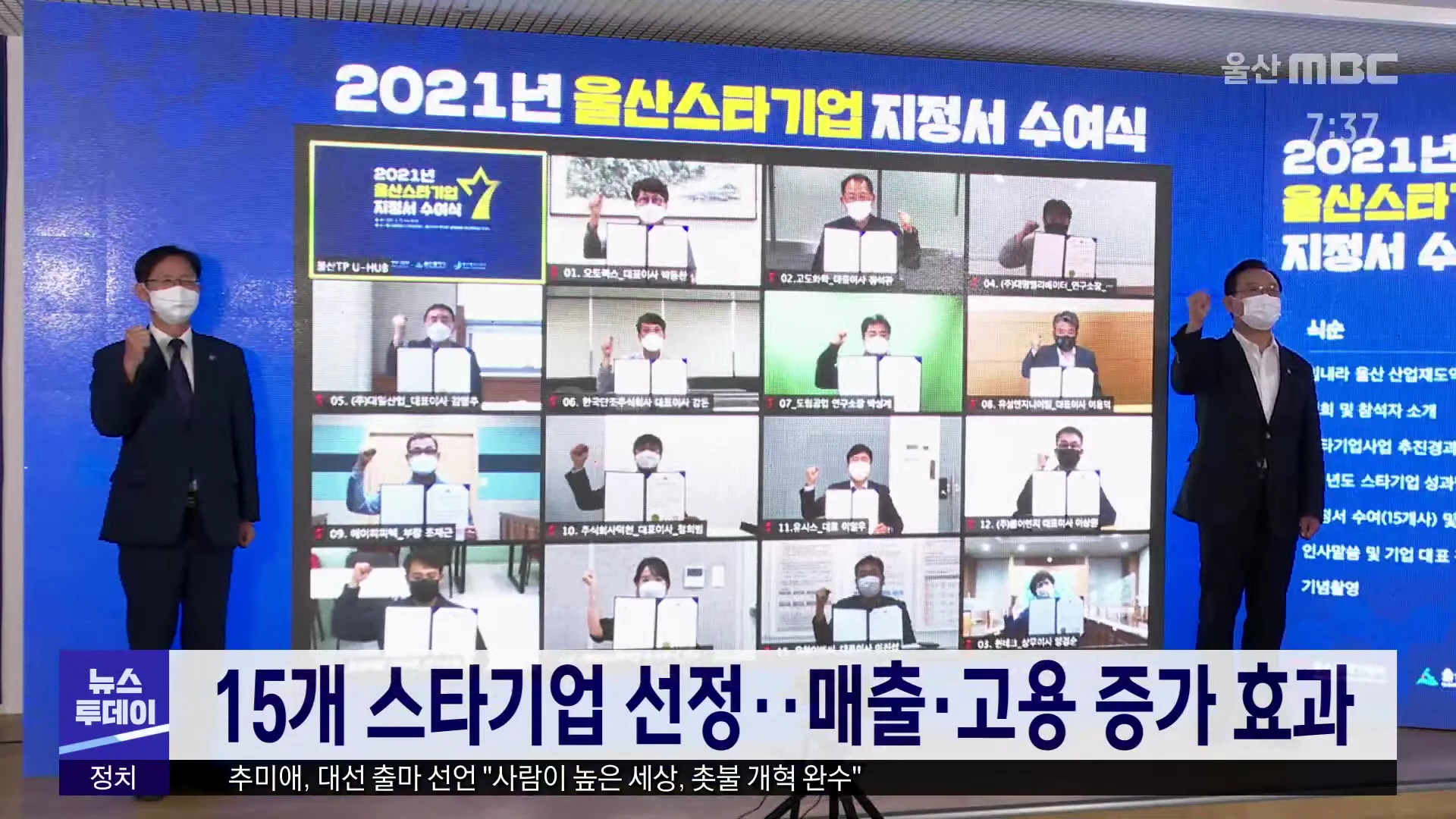 울산시가 올해 15개 스타기업을 선정했습니다. 스타기업은 본사 또 주 사업장이 울산에 있고 최근 3년간 평균 매출액이 50억 원 이상인 중소기업 가운데 선정됐습니다. 시는 지난 3년간 스타기업을 선정해 지원한 결과, 매출 6.6%, 고용 6.5%, 특허 26.5%가 증가했다고 설명했습니다. //