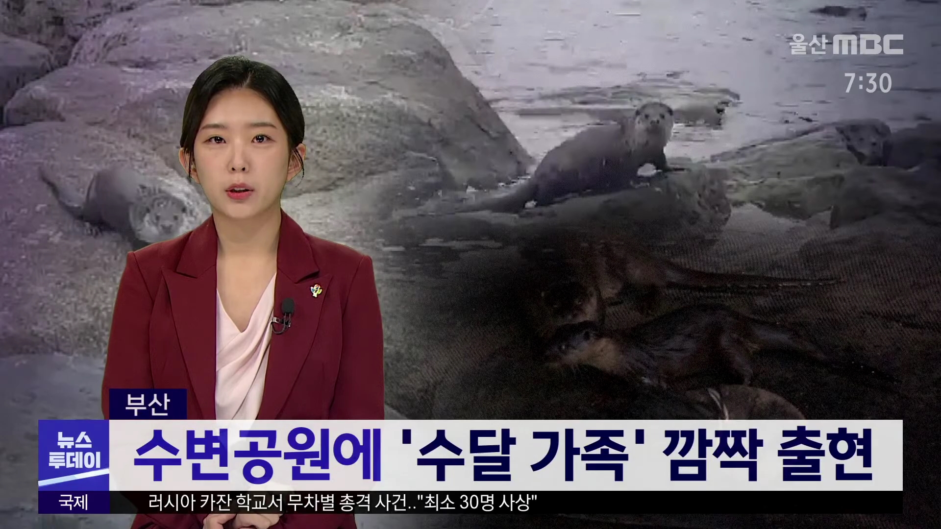 ◀ANC▶ 광안리 앞바다에서 가족으로 보이는 수달 무리가 발견됐습니다. 취재진이 확인한 결과 천연기념물 330호인 유라시아 수달이었습니다. 부산 김유나 기자입니다. ◀VCR▶ 수변공원 인근 광안리 앞바다. 수달 한마리가 물가로 나와 두리번거리더니, 바위 위를 뛰어다닙니다. 잠시 뒤 수달이 바위 속으로 들어가더니...