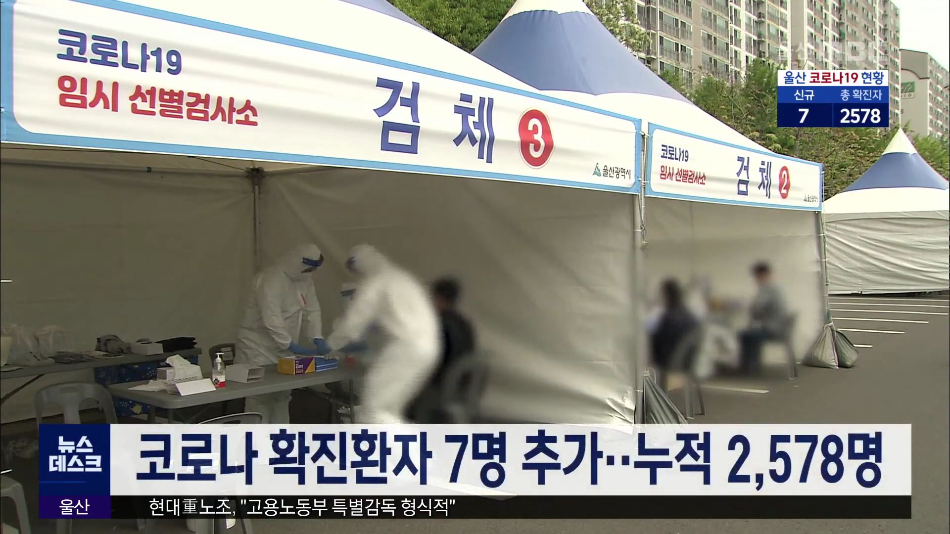 울산에서 코로나19 확진환자 7명이 추가로 발생했습니다. 이 중 6명은 기존 확진환자의 가족이거나 접촉자로 분류돼 검사를 받은 뒤 양성 판정을 받았습니다. 나머지 1명은 울주군 거주자로 동선과 접촉자에 대한 역학 조사가 이뤄지고 있습니다. 이로써 울산지역 누적 확진환자는 2천578명을 늘었습니다. //
