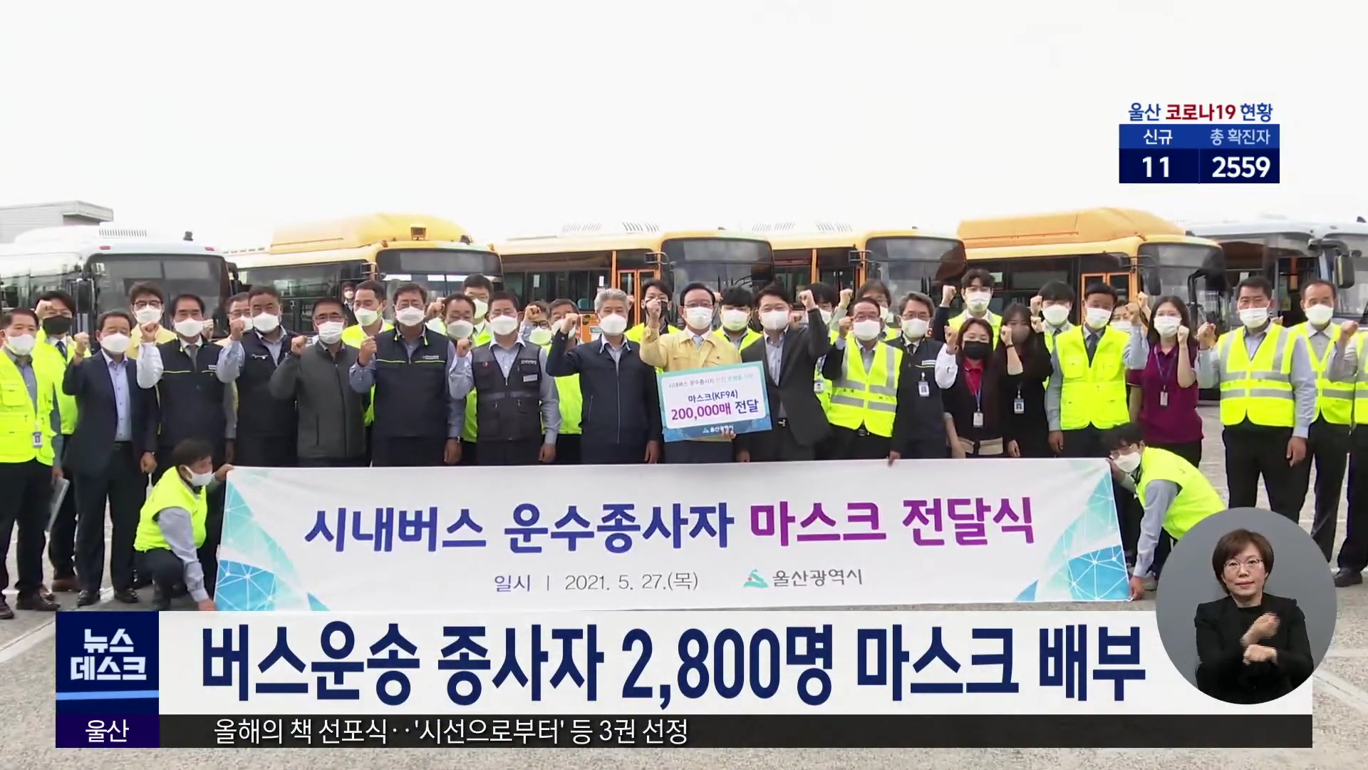 울산시가 오늘(5/27) 북구 농소 시내버스 공영차고지에서 버스운수 종사자에게 코로나19 감염 예방을 위한 마스크를 전달했습니다. 시내버스와 전세버스 기사 등 버스운송 종사자 1명당 KF94 마스크 100장씩 배부됐습니다. 지역 버스운송 종사자는 모두 2천8백여 명입니다. //
