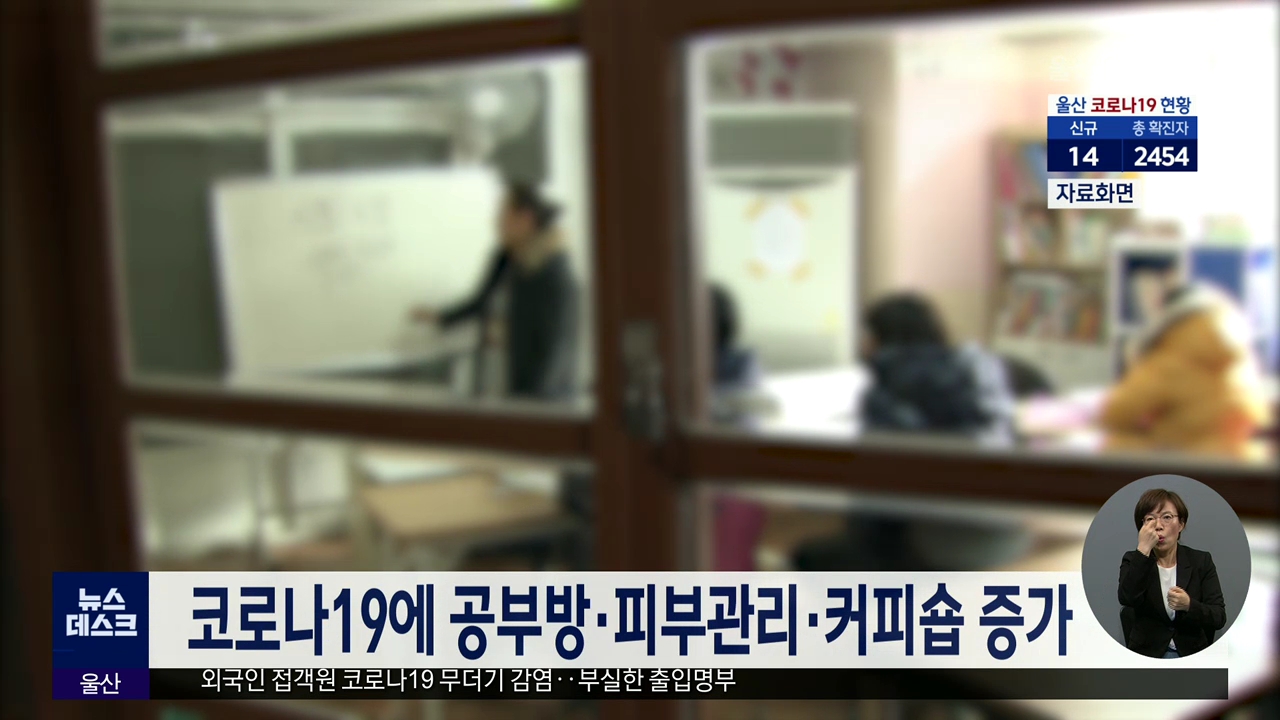 코로나 확산으로 학교 휴교와 휴원이 길어지자 공부방이 대폭 늘었습니다. 국세청 통계에 따르면 지난 2월 기준 울산지역 공부방과 교습소는 959곳으로 1년 전에 비해 203곳이 새로 생겼습니다. 헬스클럽은 130곳에서 148곳으로, 피부관리업은 858곳에서 941곳을 늘었습니다. 커피숍은 1471곳에서 1677곳으로 200곳이 더 생...