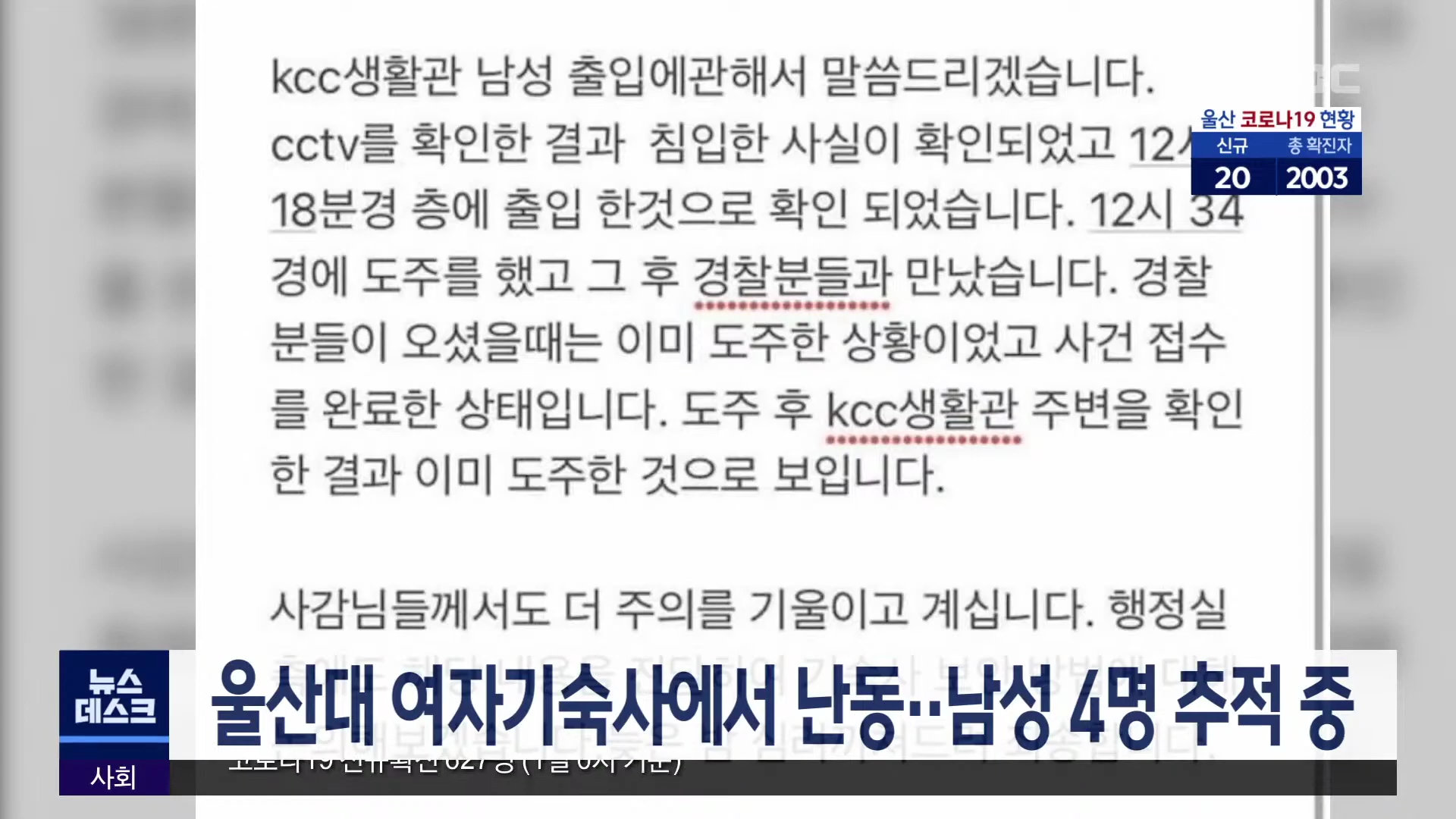 오늘(5/2) 새벽 0시 20분쯤 남구 무거동 울산대학교 여자기숙사에 남성 4명이 침입해 경찰이 추적에 나섰습니다. 이들은 여자 전용 기숙사에 침입해 여학생들이 자고 있는 방문을 세게 두드리고 복도에서 소리를 지르는 등 20여 분간 난동을 부리고 달아난 것으로 알려졌습니다. 경찰은 기숙사와 주변 CCTV 등을 토대로 달...
