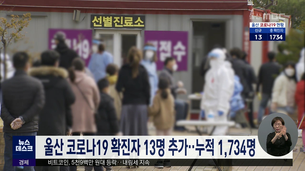 울산에서 코로나19 확진자 13명이 추가돼 누적 확진자가 1천734명으로 늘었습니다. 이중 7명은 기존 확진자의 가족 또는 접촉자이며 4명은 증상 발현으로 진단 검사 뒤 확진판정을 받았습니다. 1726번은 현대차 사내식당 관련 확진자로 이 집단에서는 지난 21일 최초 확진자가 발생한 이후 총 17명의 누적 확진자가 발생했...