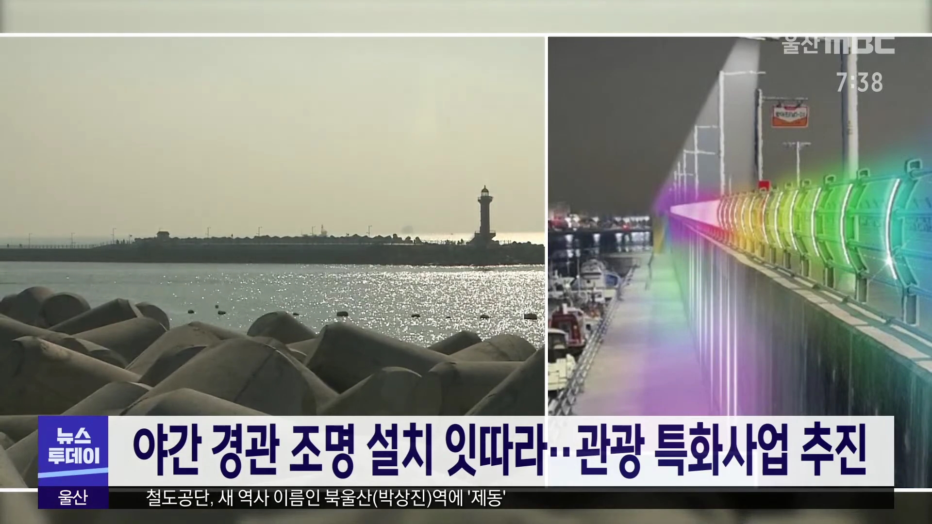 방파제나 교량 등에 야간 경관 조명이 잇따라 설치됩니다. 동구 방어진항 남방파제와 북방파제 일대에 670미터 길이의 LED 난간 조명과 바닥 조명 등이 다음달 20일까지 설치됩니다. 중구는 다음달부터 약사천에 설치된 인도교인 해오름교와 차도교인 남외교 등 2곳에 LED조명과 그림자 조명 등을 설치합니다. 중구와 동구...