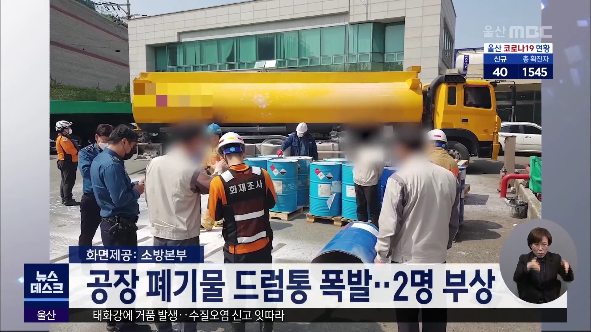 오늘(4/20) 오후 2시 5분쯤 울주군 온산읍 학남리의 한 공장에서 폐기물 드럼통이 폭발하면서 불이 났습니다. 이 사고로 폐드럼통을 옮기던 40대 남성 등 2명이 다쳐 인근 병원으로 이송됐습니다. 소방당국은 작업자 등을 대상으로 화재 발생 경위를 조사하고 있습니다. //