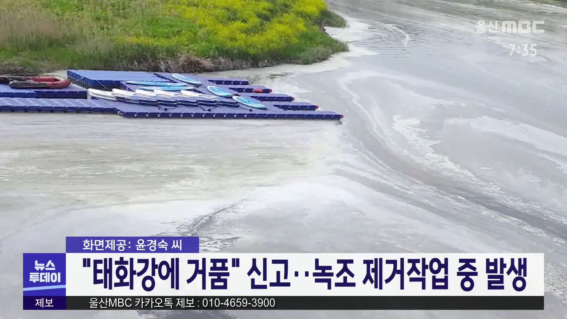어제(4/20) 오후 4시쯤 남구 태화로터리 인근 태화강에 흰 거품이 발생해 오염물질 유출을 우려한 주민들의 신고가 잇따랐습니다. 이에 대해 울산시는 최근 태화강에 발생한 녹조를 제거하기 위해 약품을 살포하는 과정에서 거품이 난 것으로 보인다며, 녹조 제거용 약품에는 유해성이 없다고 설명했습니다.//