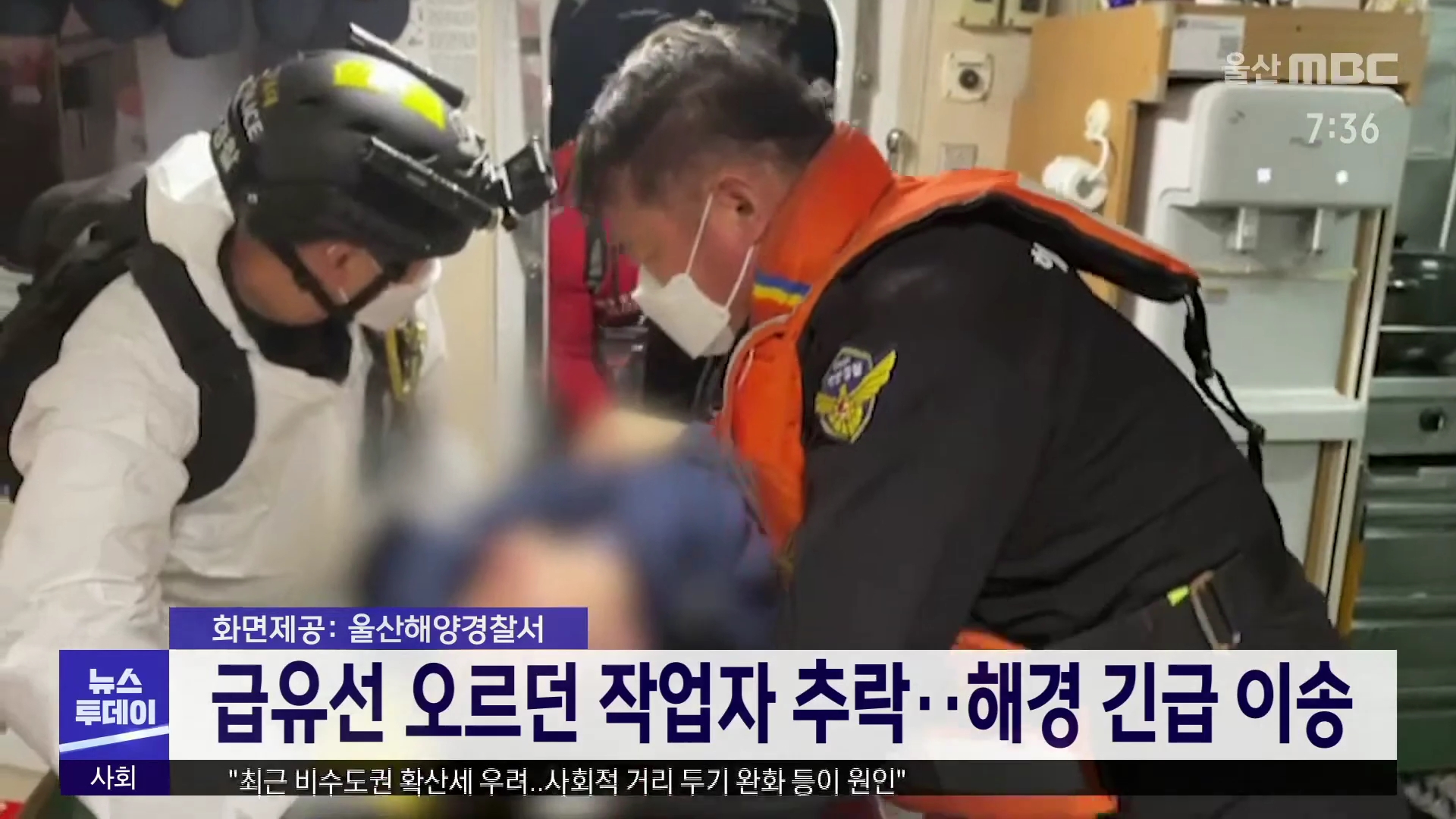 어제(3/31) 저녁 9시 15분쯤 울산항 묘박지 인근 급유선에서 화물 샘플 작업을 위해 배에 오르던 작업자 31살 A 씨가 추락해 부상을 당하는 사고가 발생했습니다. 신고를 받고 출동한 해경은 A 씨를 경비정으로 이송해 인근 병원으로 옮겼으며 생명에는 지장이 없다고 밝혔습니다.