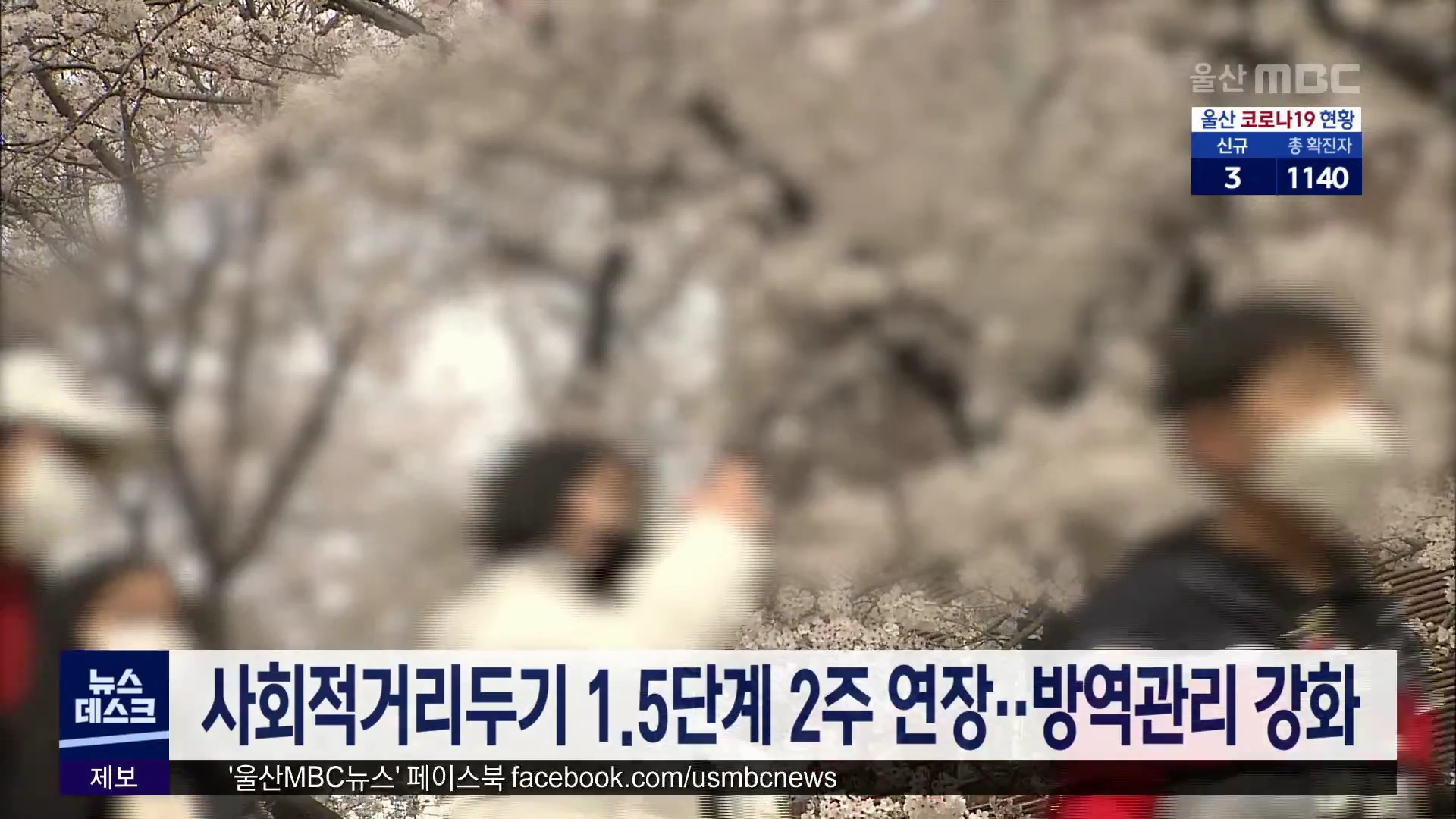 울산시가 코로나19 유행의 안정화를 위해 사회적거리두기 1.5단계를 다음달 11일까지 2주간 유지하고 방역관리를 강화한다고 밝혔습니다. 또한 벚꽃 등 개화시기에 맞춰 4월 30일까지를 방역 집중관리 기간으로 정하고, 주요 관광지를 중심으로 방역수칙 이행여부를 점검합니다. 방역수칙 위반업소는 '원스트라이크 아웃제'...