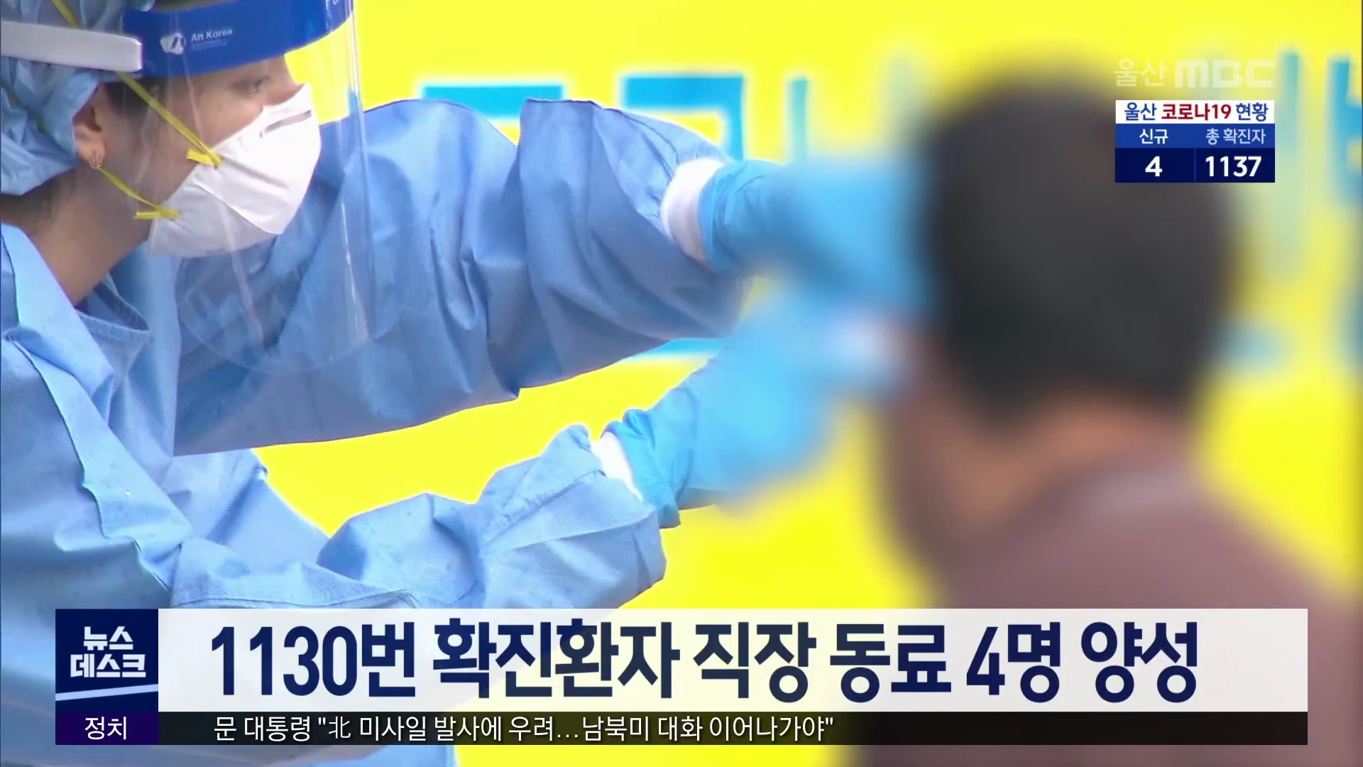 오늘(3/27) 울산에서는 직장의 확진자와 접촉한 동료 4명이 코로나19 확진 판정을 받았습니다. 신규 확진환자 4명은 20대에서 40대로, 지난 26일 양성 판정을 받은 1130번 확진환자와 같은 회사에 다니는 동료 직원들입니다. 이로써 울산지역 누적 확진환자는 1천137명으로 늘었습니다. //