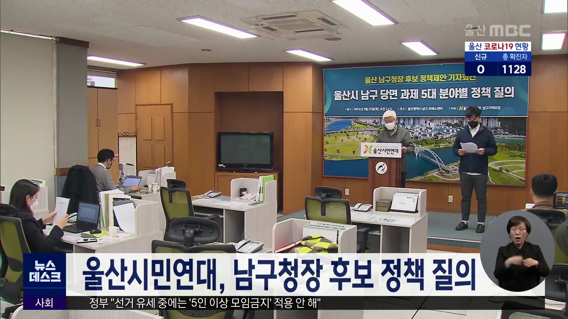 4.7 지방선거 재보선 공식선거운동이본격적으로 시작된 가운데 울산시민연대가남구청장 후보들에게 정책제안을 내놨습니다.시민연대는 남구청에서 기자회견을 열고남구청장 후보자들에 대해장생포 문화창고 운영방안,저소득층 국민건강보험료 지원 확대, 참여예산제 활성화 방안 등5가지 분야 정책에 대한 답변을 요구했습...