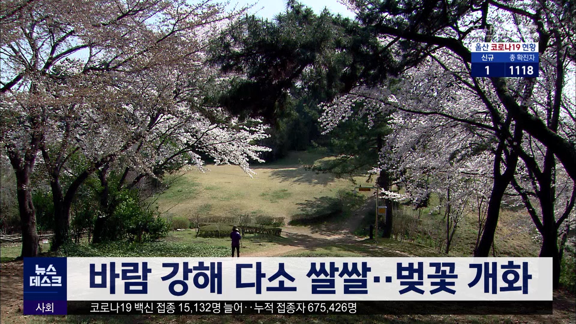 오늘(3/21) 울산지방은 구름 많은 가운데 바람이 강해 다소 쌀쌀하게 느껴지는 하루였습니다. 거리에는 벚꽃이 개화하기 시작했고 개나리가 만개해 봄을 느끼게 했습니다. 내일(3/22) 울산지방은 3도에서 14도의 기온분포를 보이며 대체로 맑겠습니다. 이번주는 내내 맑다가 주말쯤 비가 오겠습니다.//