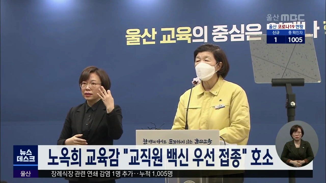 노옥희 교육감은 백신 접종을 앞두고 오늘(2/25) 정부에 교직원에게 백신을 우선 접종해 줄 것을 요청하는 성명서를 발표했습니다. 노 교육감은 학생들을 위해 등교 수업을 확대하고 지속해야 한다며 3분기로 예정된 교직원 백신 접종 계획을 앞당겨 실시해달라고 밝혔습니다. 지난해 개학연기와 원격수업으로 학습권 침해...
