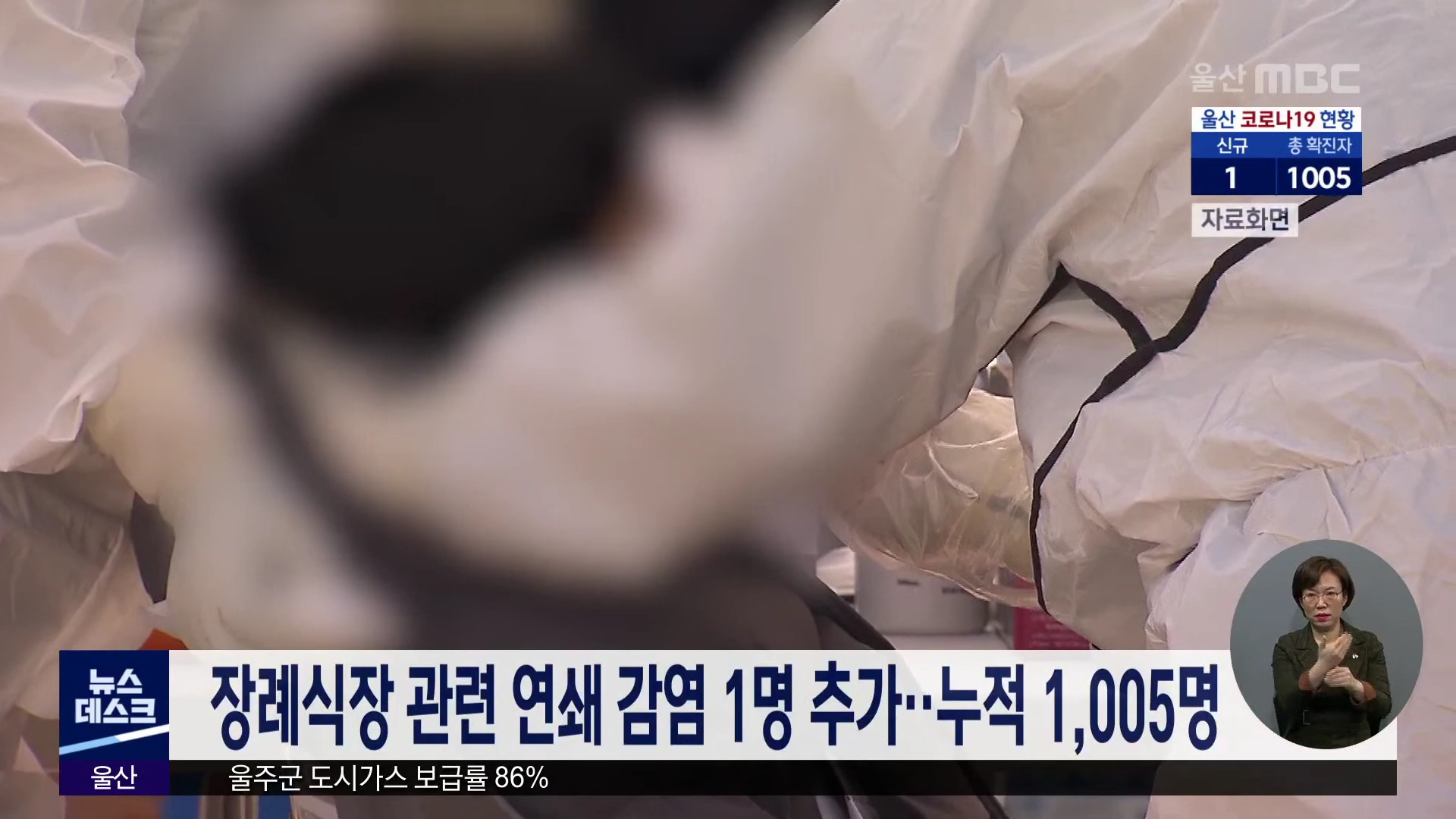 울산에서는 부산지역 장례식장과 관련한 연쇄 감염으로 코로나 확진자 1명이 발생했습니다. 북구에 거주하는 10세 미만 어린이가 확진 판정을 받았으며, 이 어린이는 부산 장례식장과 관련해 확진된 977번의 가족입니다. 이로써 해당 장례식장과 직·간접적으로 관련된 울산지역 누적 확진자는 모두 33명으로 늘었습니다.