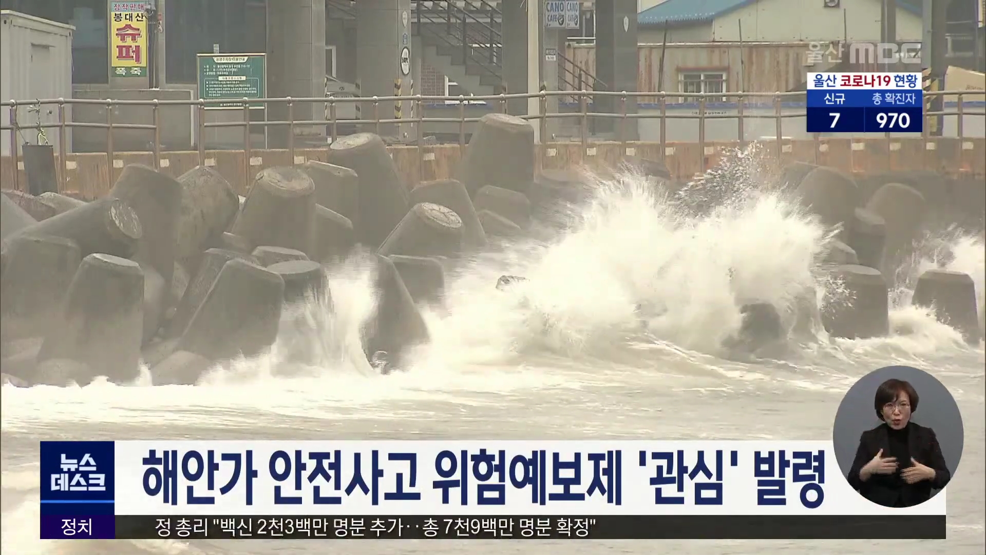 울산해양경찰서는 해안가에 강풍을 동반한 너울성 파도가 예상됨에 따라 오늘(2/16)부터 5일간 연안안전사고 위험예보제 '관심' 단계를 발령한다고 밝혔습니다. 해경은 위험예보제 발령 기간 동안 사고 발생이 우려되는 항포구, 갯바위, 방파제 등을 중심으로 순찰 활동을 강화할 예정입니다. //