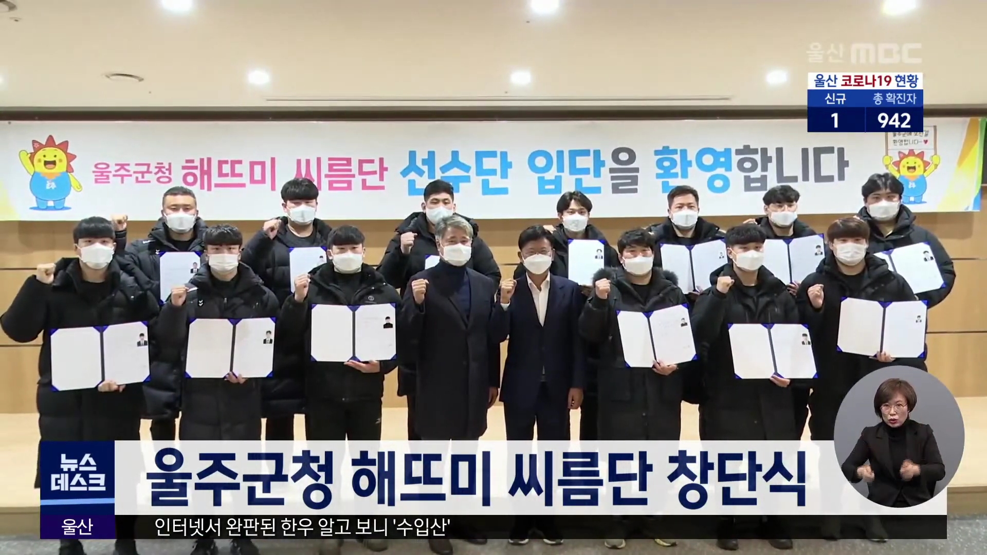 울산 울주군이 운영하는 '해뜨미 씨름단'이 오늘(2/5) 출범했습니다. '해뜨미 씨름단'은 이대진 감독을 영입하고 기존 동구청 돌고래씨름단 선수단 외에 울산대 졸업 선수 등 신규 선수 4명을 영입해 모두 14명 규모로 꾸려졌습니다. 씨름단은 오는 11일 합천에서 열리는 설날장사 씨름대회에 첫 출전합니다.//