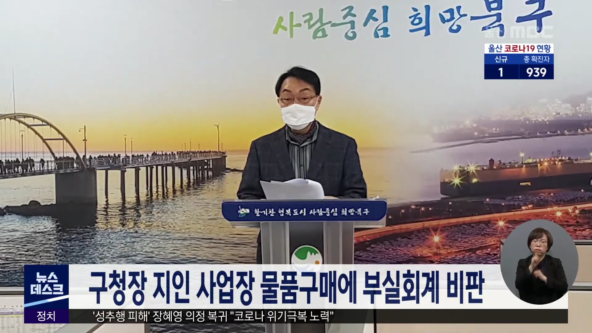 북구의회 정치락 의원이 오늘(2/2) 북구청에서 기자회견을 열고 체육회가 자치단체 행사 물품을 구청장 지인 사업장에서 구매하는 과정에서 회계처리가 부실했다고 지적했습니다. 정 의원은 지난 2019년 구민생활체육대회에 체육회 사무국장의 배우자 사업장에서 2천여만 원 상당의 물품을 관련 증빙자료 없이 계좌이체로 ...