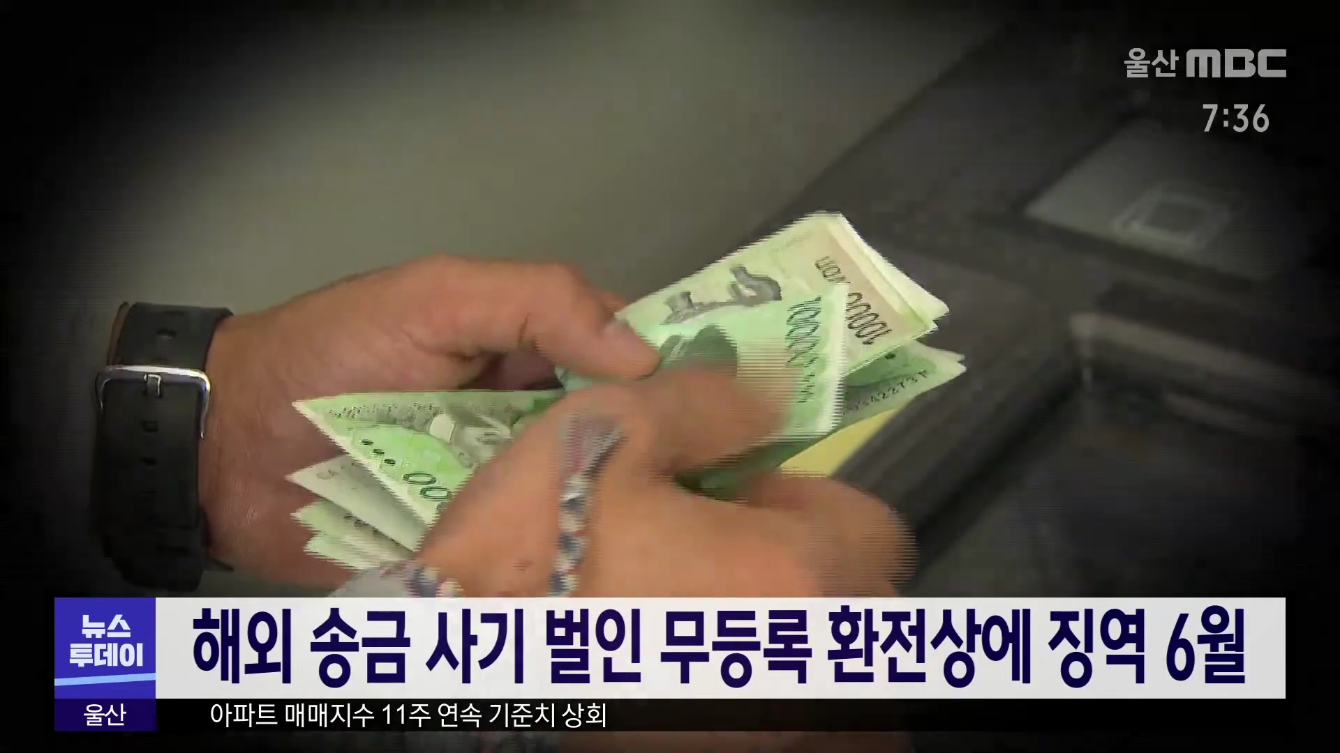 울산지방법원 문기선 판사는 해외 송금 사기를 벌인 혐의로 기소된 37살 A씨에게 징역 6개월을 선고했습니다. A씨는 지난 2019년 남구에서 무등록 환전 사무실을 운영하면서 중국에 돈을 대신 보내주겠다고 속여 의뢰인으로부터 5천만 원을 가로채 자신의 빚은 갚은 혐의로 기소됐습니다.