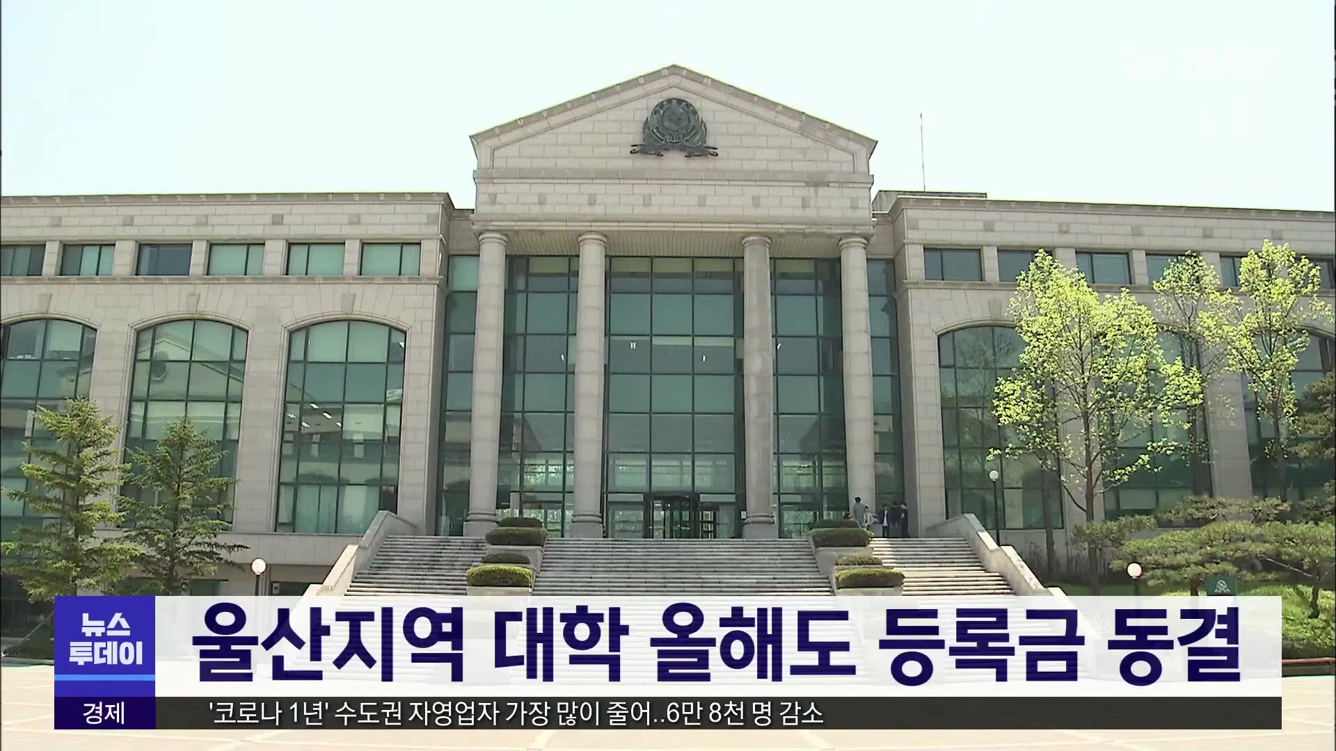 울산지역 대학들이 올해도 등록금을 동결할 전망입니다. 울산대학교와 유니스트는 코로나19에 따른 경기 침체를 고려해 올해도 등록금을 동결하는 쪽으로 가닥을 잡고 있습니다. 또 울산과학대학교와 춘해보건대학교도 올해 등록금을 동결하고 입학금은 인하하는 것으로 알려졌습니다.//