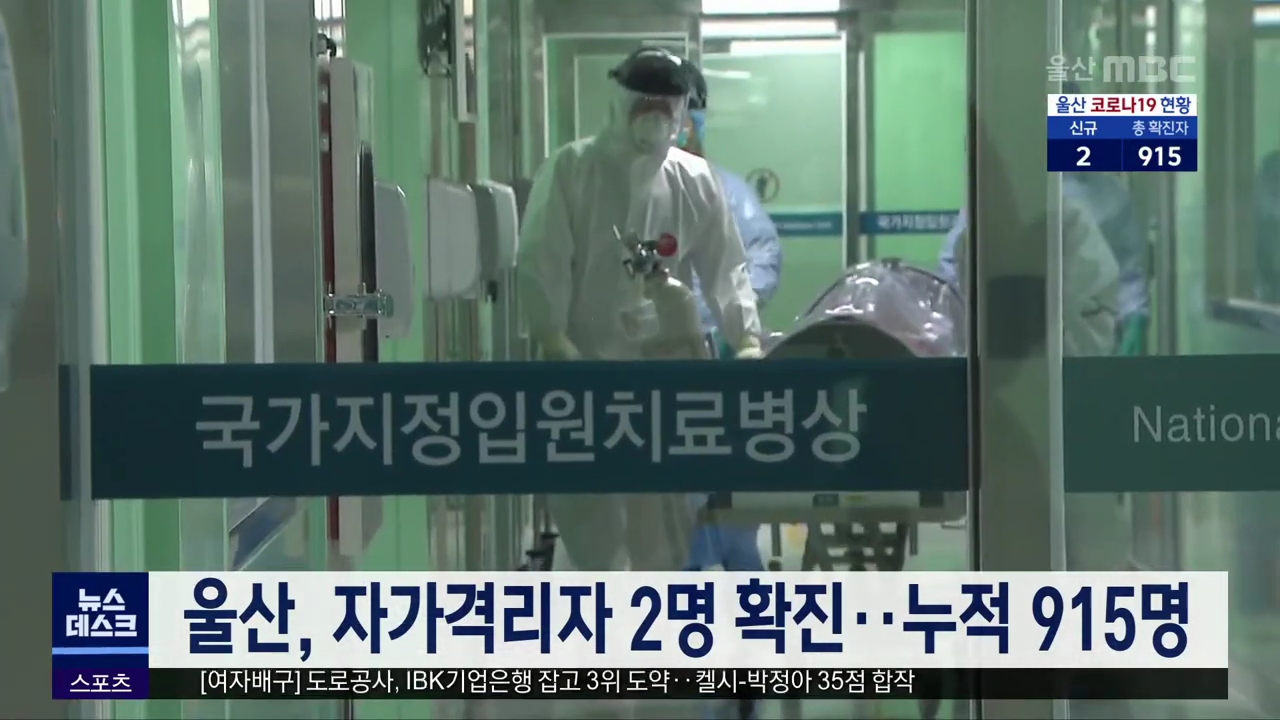 울산에서 코로나19 확진 환자 2명이 추가돼 각각 914번, 915번 환자로 분류됐습니다. 50대 여성인 914번 환자와 20대 남성인 915번 환자는 지난 9일 확진 판정을 받은 809번의 가족으로, 자가격리 해제 전 검사에서 감염이 확인됐습니다.//