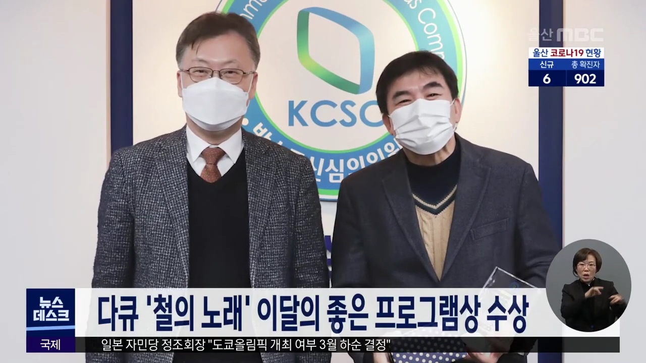 울산MBC 이영훈 PD가 제작한 다큐 '철의 노래'가 오늘(1/19) 서울 방송회관에서 방송통신심의위원회가 주관하는 이달의 좋은프로그램 상을 받았습니다. 라디오 다큐로 제작된 '철의 노래'는 우리나라 쇠부리 소리를 통해서 화려했던 철의 역사와 삶의 애환을 한편의 이야기처럼 자연스럽게 풀어낸 점을 높이 평가 받았습니...