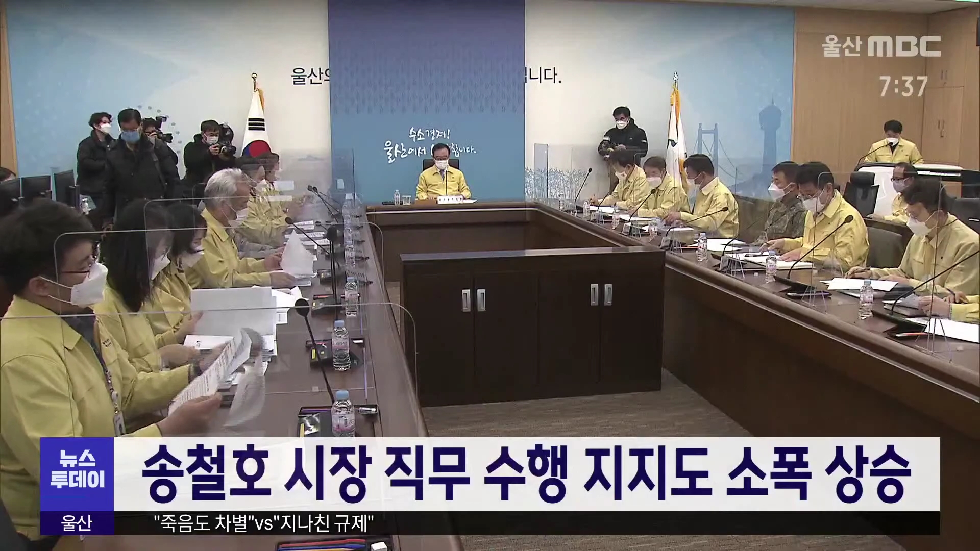 송철호 울산시장의 직무 수행 지지도가 지난해 하반기에 소폭 상승한 것으로 나타났습니다. 여론조사 전문기관 한국갤럽의 2020년 하반기 시도지사 직무 수행 평가 결과, 송 시장의 직무 긍정률은 43%로 12위를 차지해 상반기에 비해 7%포인트 가량 올랐습니다. 이번 조사는 휴대전화와 집전화를 이용한 전화 인터뷰 방식으...