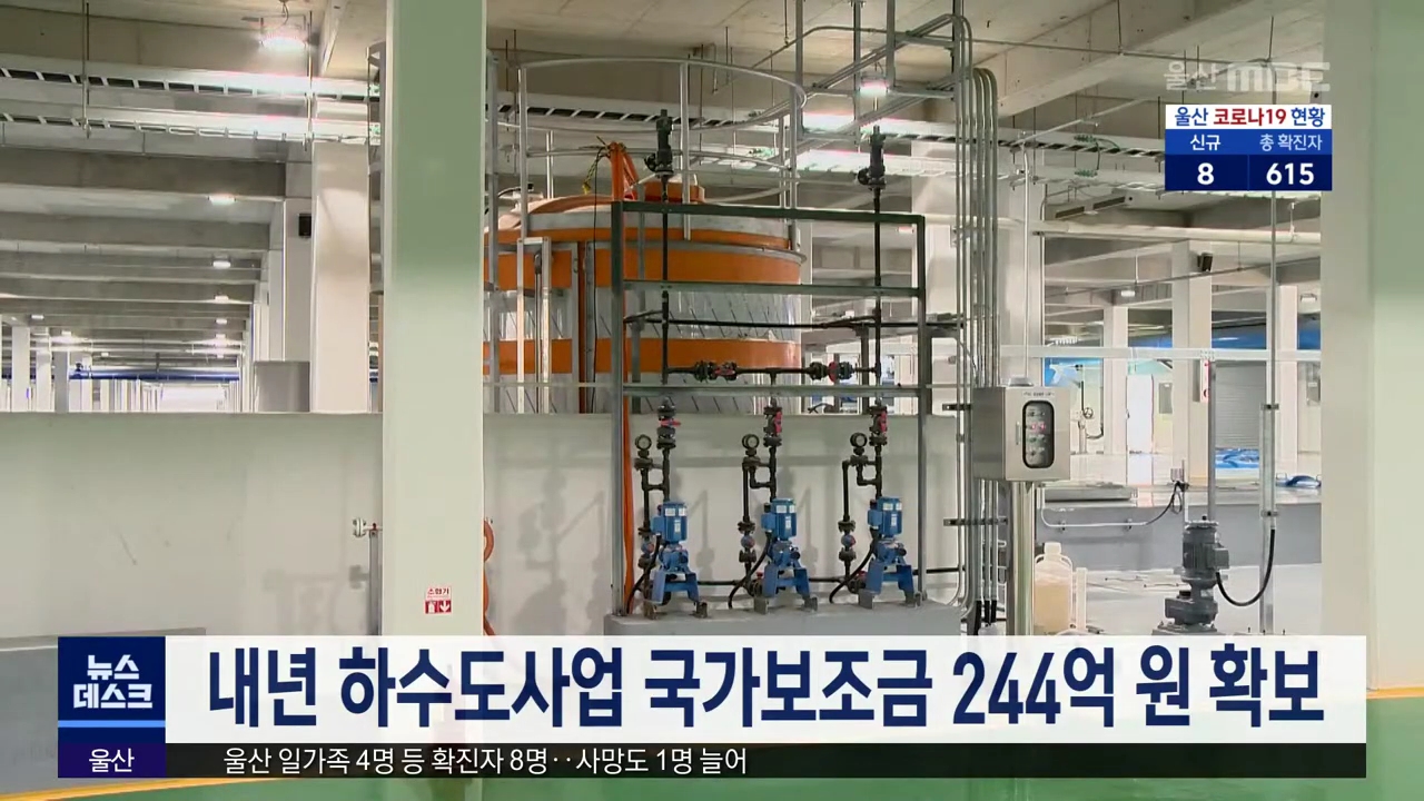 울산시는 2021년 하수도 사업과 관련해 국고보조금 244억 원을 확보했다고 밝혔습니다. 확보한 국고보조금은 3개 신규사업에 12억 원, 11개 계속사업에 232억 원입니다. 특히 신규사업은 회야하수처리시설 증설과 회야처리구역 차집관로 정비, 온산처리구역 하수관로 시설개선 등입니다. //