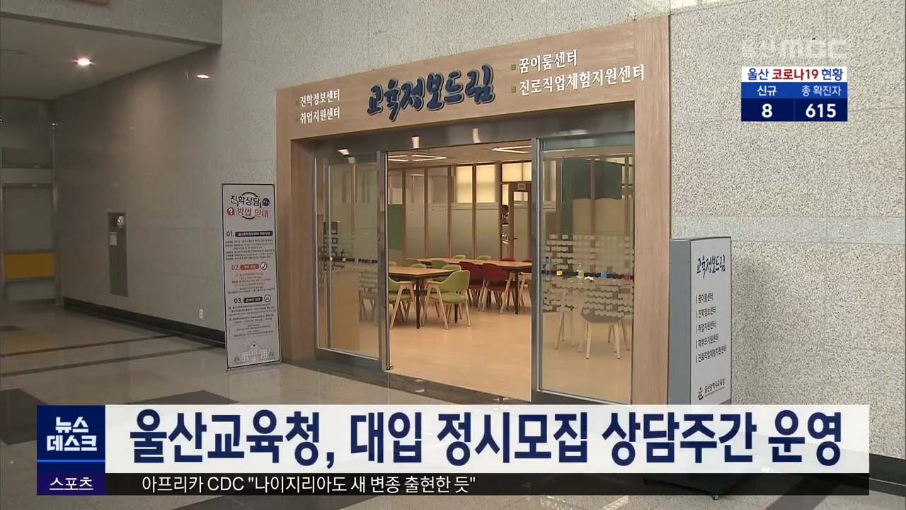 울산교육청이 수능 점수 배부가 끝남에 따라 내일(12/26)부터 다음 달 6일까지 대입 정시모집 상담주간을 운영합니다. 시교육청은 코로나19 확산을 우려해 올해는 대규모 진학 특강 대신, 진학정보센터에서 소그룹 상담제를 운영한다고 밝혔습니다. 1대1 대면 상담은 예약제로 평일은 오후 4시부터 9시, 토요일은 오전 9시...