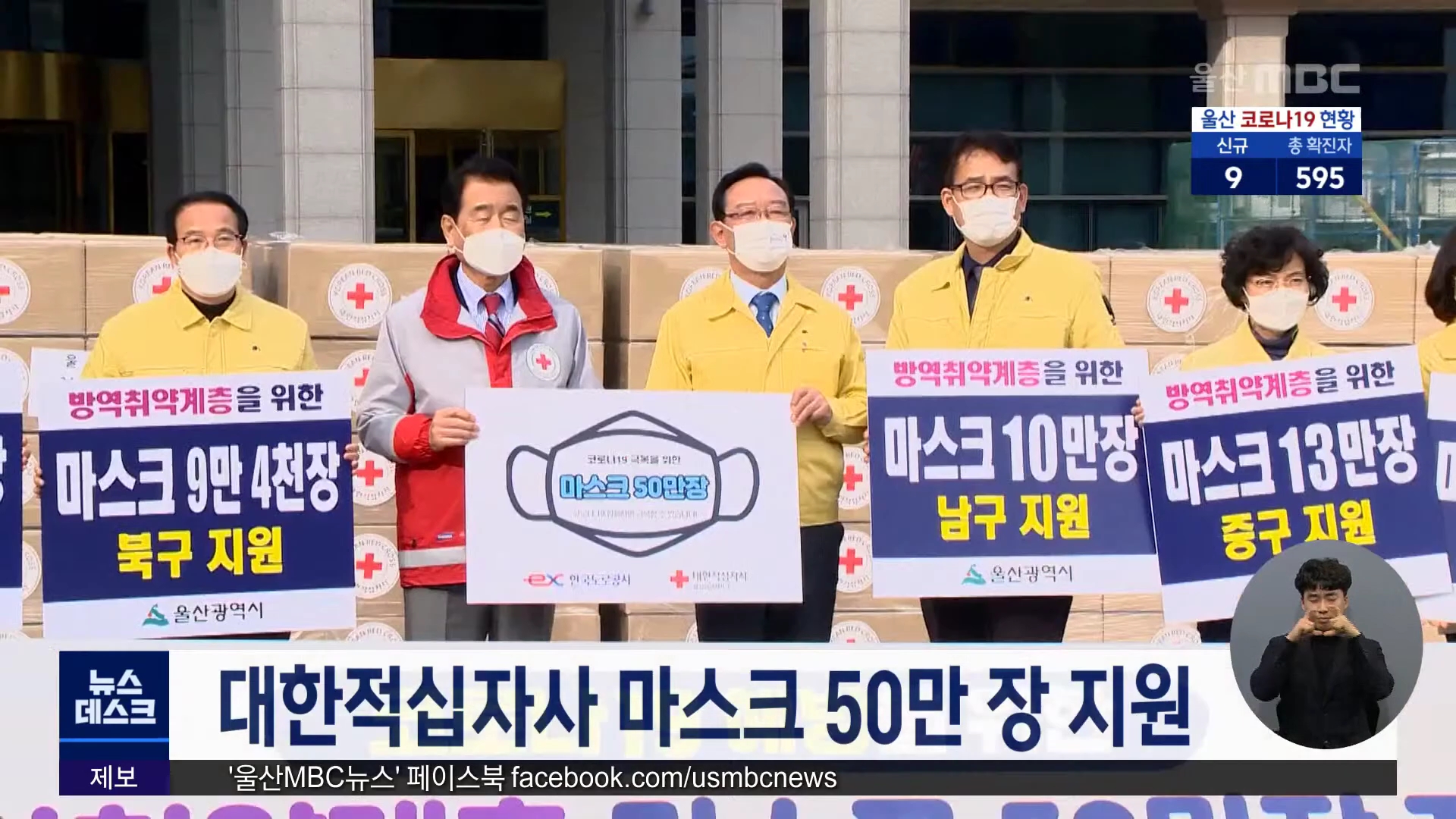 대한적십자사 울산지사는 오늘(12/23) 시청에서 코로나19 취약계층에게 마스크 50만 장을 전달했습니다. 대한적십자사는 한국도로공사가 지난 추석기간 고속도로 통행료를 기부함에 따라 이를 재원으로 공적 마스크를 구입했다고 설명했습니다. 울산시는 노인복지관과 장애인보호시설, 요양원 등에 마스크를 나눠줄 계획입...