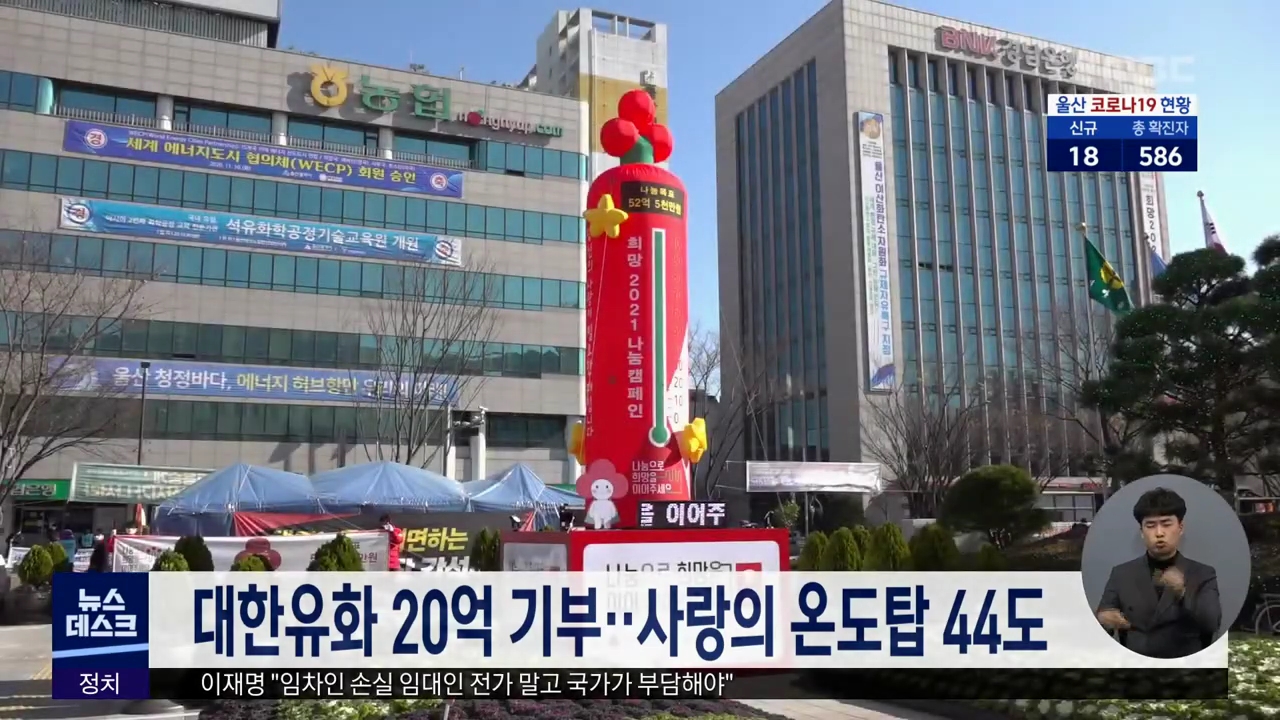 코로나19 확산세로 기부 활동이 위축된 가운데 대한유화가 희망 2021 나눔 캠페인 성금으로 울산시에 10억 원, 남구와 울주군에 각각 5억 원씩 모두 20억을 쾌척했습니다. 울산사랑의열매는 대한유화 기부로 사랑의 온도탑 온도가 한번에 19도가 올라 현재 44도를 기록하고 있다고 설명했습니다. 사랑의열매는 코로나 영향...