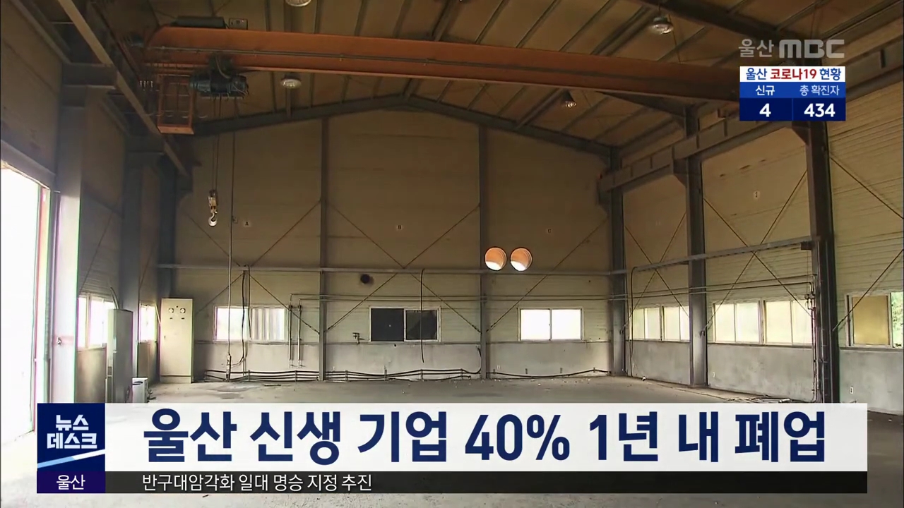 울산지역 신생기업 10곳 중 4곳은 1년을 넘기지 못하고 폐업하는 것으로 나타났습니다. 통계청이 발표한 2019년 기업 생멸통계에 따르면 지난해 상용 근로자를 고용한 신생기업은 1년 전보다 5% 늘어난 1만8천300여 개로 나타났습니다. 하지만 2018년 기준으로 1년 이상 생존한 신생기업은 61.7%로 전년보다 2.1%p 하락했고...