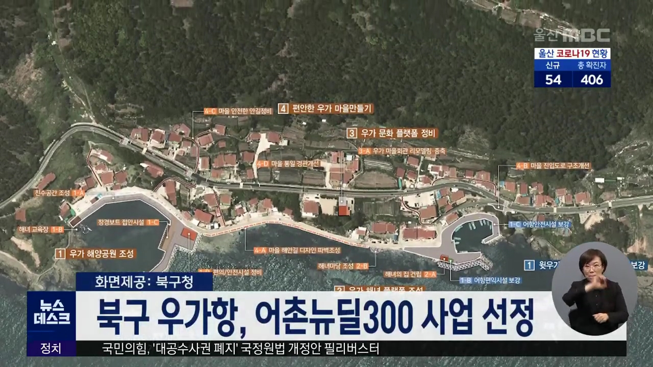 북구 강동 우가항이 해양수산부 어촌뉴딜300 사업에 선정됐습니다. 어촌뉴딜300 사업은 낙후된 어촌 시설을 현대화하고 특화 개발을 추진해 어촌지역에 활력을 불어넣는 사업입니다. 북구는 내년부터 총 사업비 70억 원을 투입해 우가 해양공원 조성, 어항시설 정비, 해녀 플랫폼 조성 등을 추진할 예정입니다. //