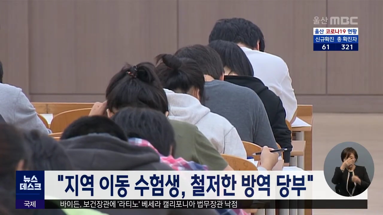 수능 이후 코로나19 확산 우려가 커지고 있는 가운데,울산교육청이 타지역을 오가며 논술과 실기 고사 등을 치르는 수험생들에게 각별한 주의를 당부했습니다. 시교육청은 오는 22일까지 전국에서 60만 건이 넘는 대면 평가가 실시될 것으로 보고, 감염병 예방 수칙을 철저히 지켜달라고 강조했습니다. 한편 울산과학기술원...