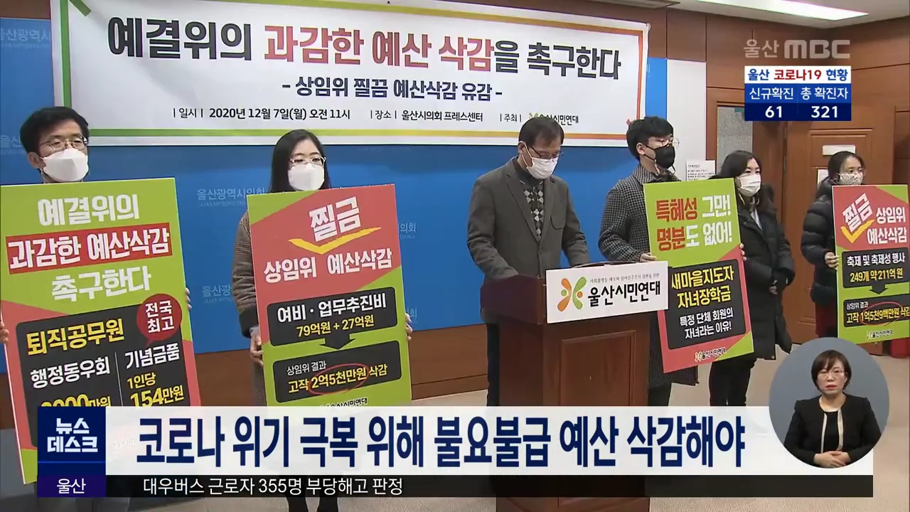 울산시민연대는 퇴직공무원 친목 단체 지원 등 불요불급한 예산을 삭감해 코로나19 위기 극복을 위한 사업에 사용해야 한다고 주장했습니다. 시민연대는 특정 단체 자녀에게만 주는 장학금은 형평성과 보편성에 맞지 않는다는 지적에도 불구하고 1천 200만원이 그대로 편성됐고 국감에서 지적됐던 전국 최고 수준의 퇴직공...