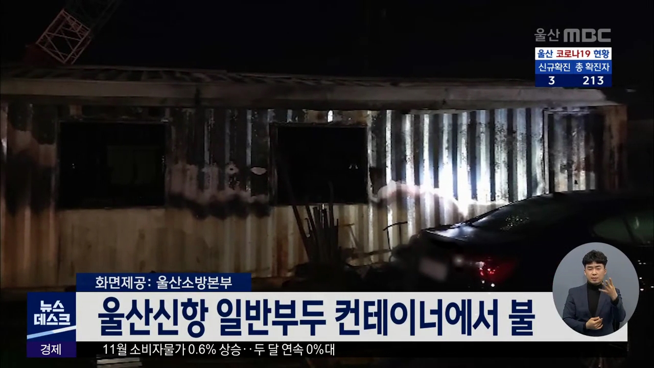 어젯밤(12/1) 11시 15분쯤 남구 울산신항 일반부두 안 컨테이너에서 불이 나 소방서 추산 493만원 상당의 재산피해를 내고 30분만에 꺼졌습니다. 이 불로 컨테이너 안 집기와 주변 승용차 2대가 불에 탔습니다. 소방당국은 컨테이너 안에서 불이 시작됐다는 경비원의 말 등을 토대로 정확한 화재원인을 조사하고 있습니다./...