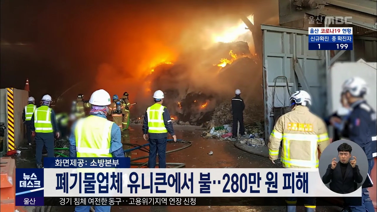 오늘(11/30) 낮 12시 55분쯤 울주군 온산읍 당월리의 폐기물업체 유니큰에서 불이 나 산업폐기물 5톤 등을 태워 소방서 추산 280만 원의 재산 피해를 내고 1시간 만에 꺼졌습니다. 소방당국은 폐기물 보관 창고에서 불이 난 것으로 보고 목격자 등을 상대로 화재 발생 경위를 조사하고 있습니다. //